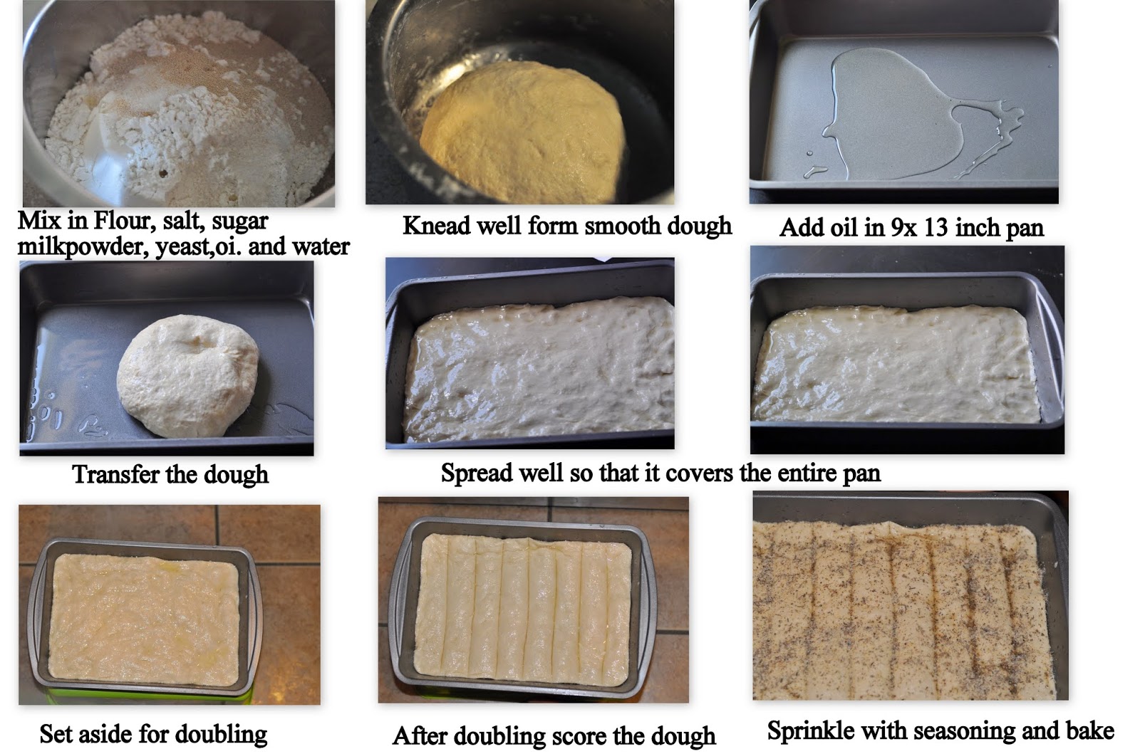 If you have All-purpose flour/Maida, dry milk powder, yeast and salt, water and little sugar mix everything and let yeast takeover from here. It will take about 2 hours to double in volume. Once it is doubled score the dough using a pizza cutter. This helps for easy removal of each breadsticks after it is baked.   If you don’t have dry milk powder in your hand, it is no problem, try it with milk, I did that version too, only points to note is reduce the amount of water in that case.