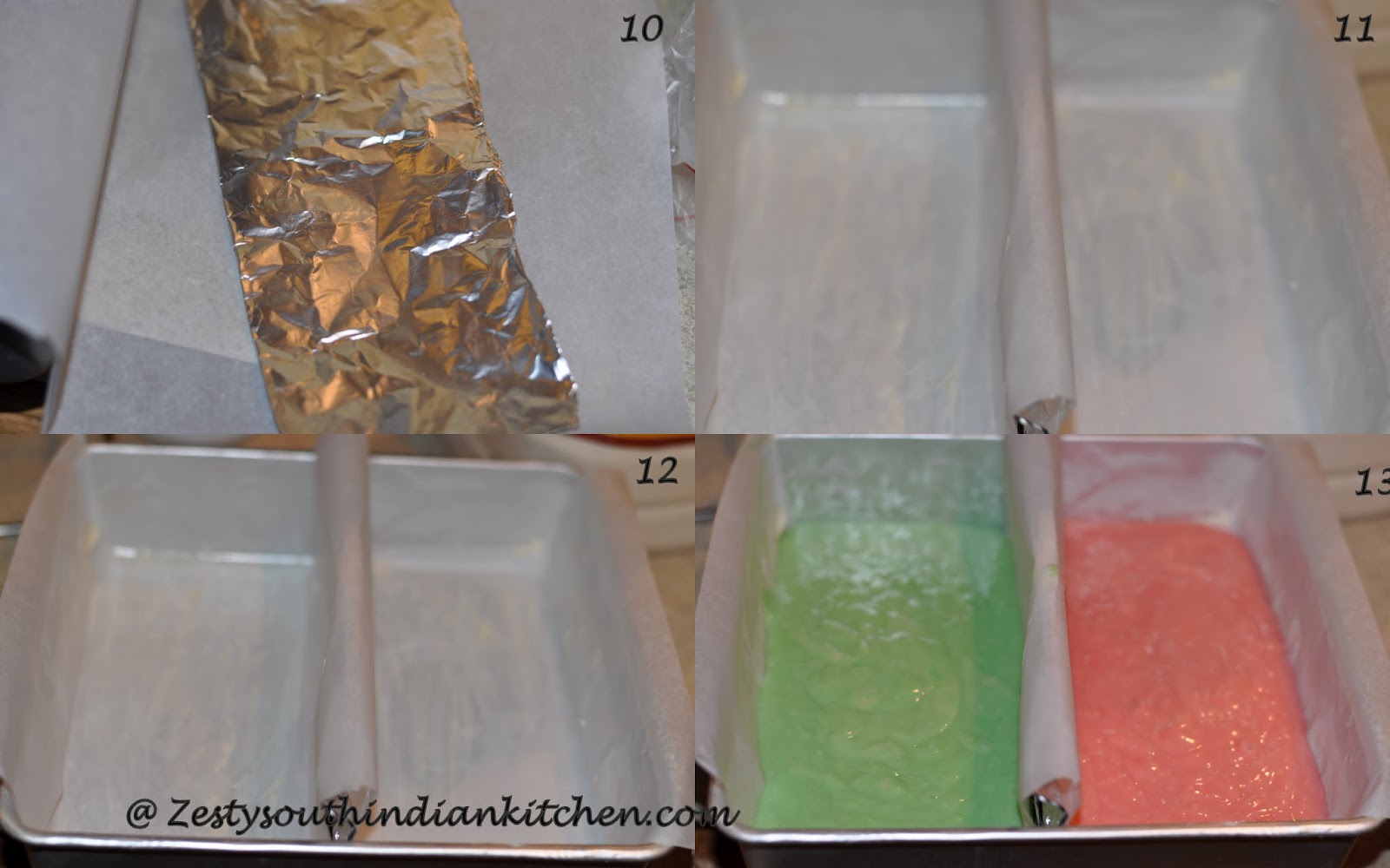 Spoon the red batter into the one half and other with green color batter of the prepared baking pan.Smooth the surface of the batter with a spatula, making sure batter is in each corner.