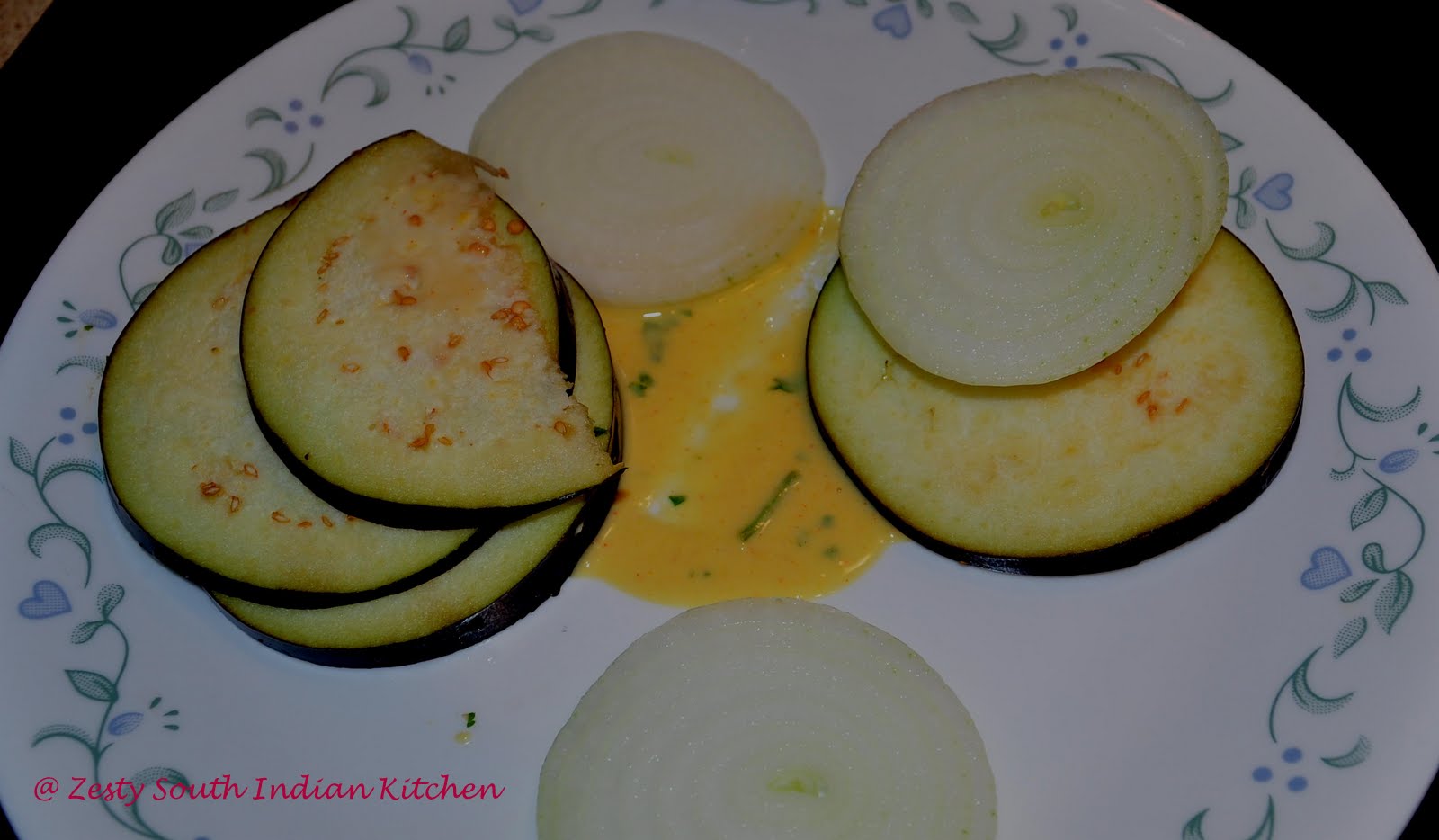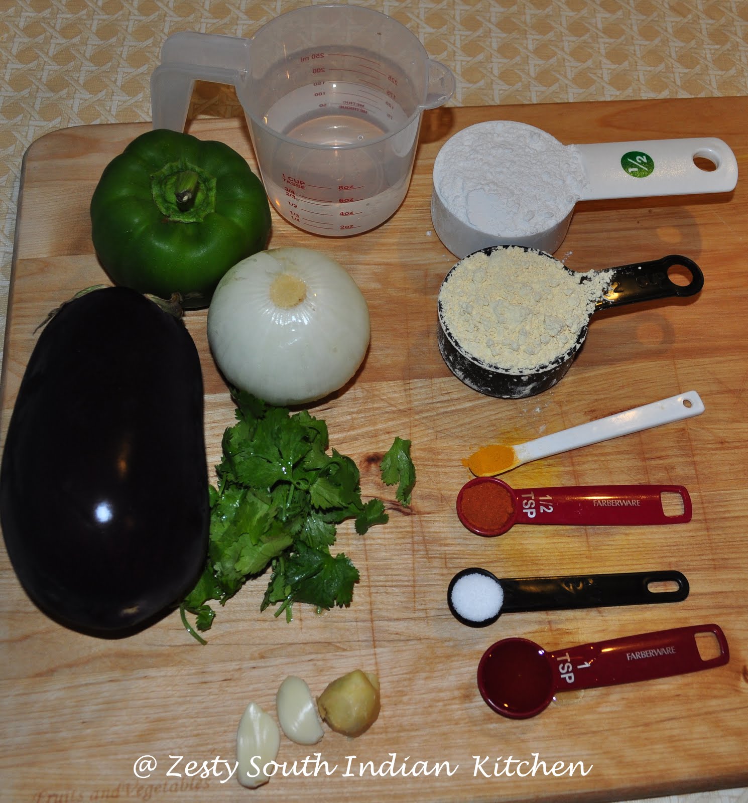 Wash and peel the skin of egg plant, onion and cut into thin rounds and keep aside. Cut green bell pepper into 4 inch strips and keep aside.