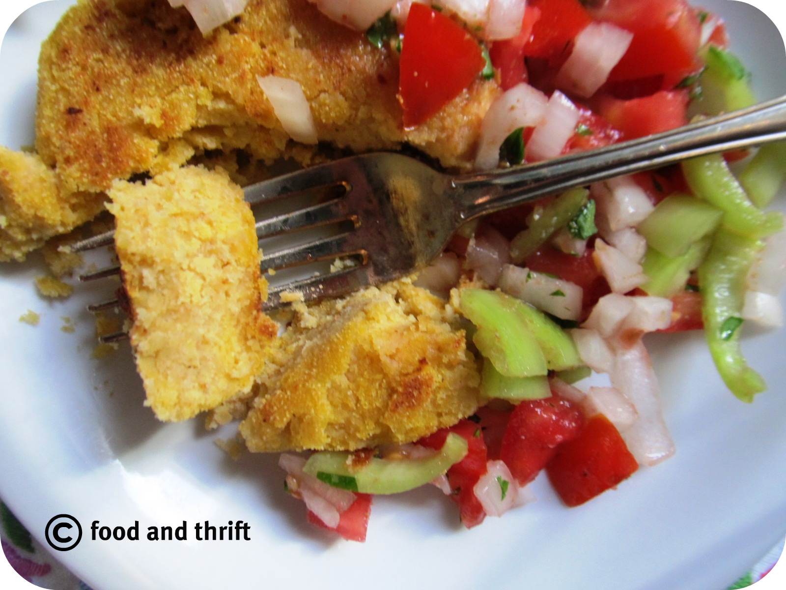 Form chickpea mixture into 6 (3 inch round cakes. I formed 4- 4 inch round cakes) Spread remaining ¼ cup cornmeal on sheet of waxed paper, (I used a flat plate) lightly coat cakes with cornmeal.