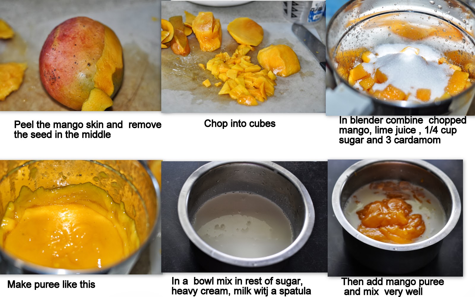 - In a blender puree the mango, ¼ cup sugar, cardamom and lemon juice until very smooth.
