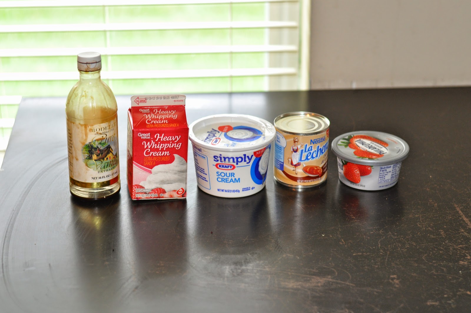 - Spread a generous amount of sour cream-cream cheese whipped cream onto one cookie, then top with another. Then fill with dulce de leche whipped cream. Then top with another cookie Continue in this manner - stacking the layers on top of one another and spreading some cream in-between. Cover the sides and top of the cake with cream as well.