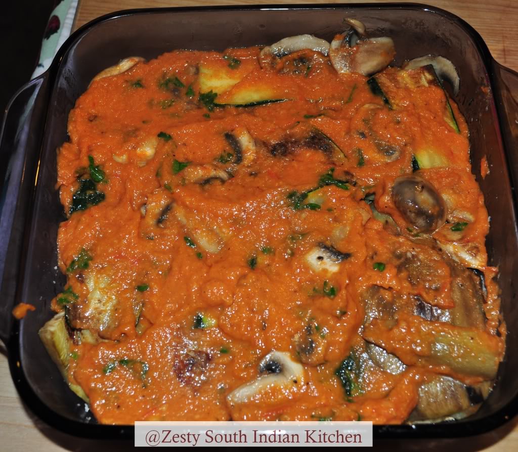 Then arrange second layer of eggplant, zucchini,potato and mushroom and add layer of tomato sauce.