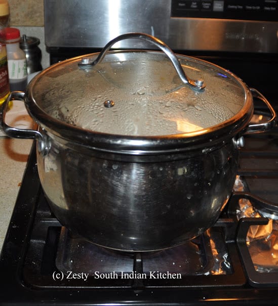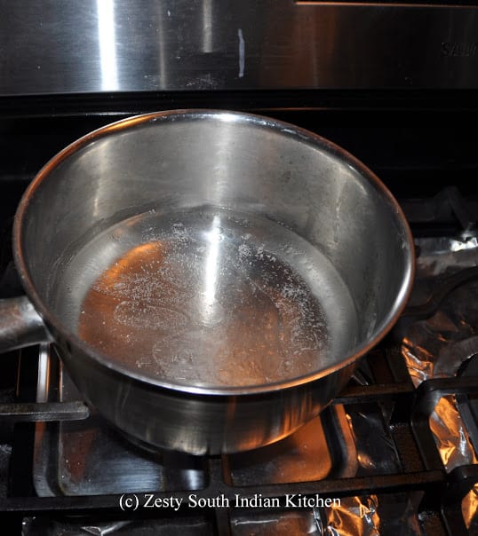 Heat a thick bottomed pan and add 1 teaspoon of coconut oil to it. Add 2 cup of water and salt and bring it to boil.
