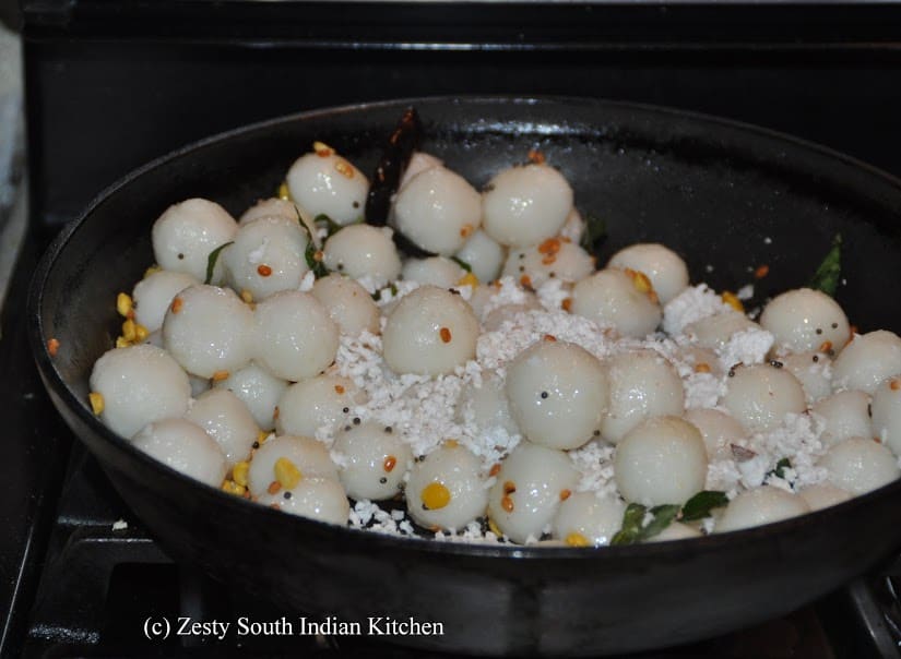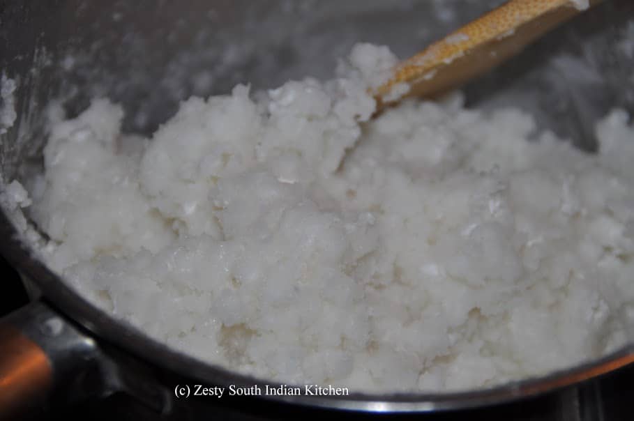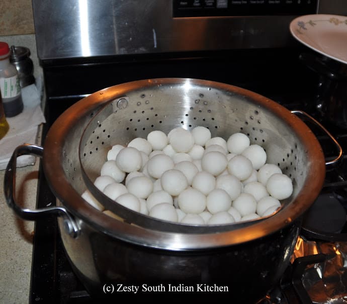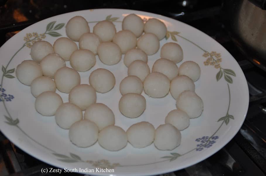 Make small marble sized balls with 1 teaspoon of dough and steam in a steamer or idli cooker for 20 minutes. Allow to cool.