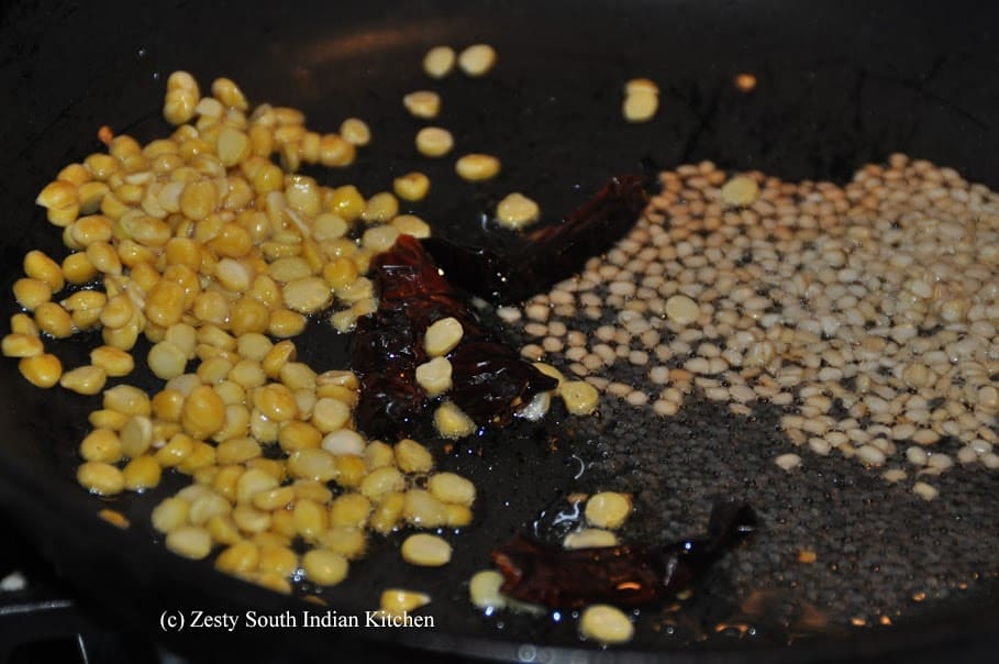 Heat the remaining oil in a pan and when the oil starts smoking, add mustard seeds, urad dal, soaked chana dal and broken red chillies.