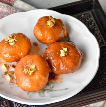 You need to make sure that sugar syrup is warm otherwise it won’t penetrate into the cooked badusha. Remove from the sugar syrup and serve with salted toasted pistachio which is really nice combo.