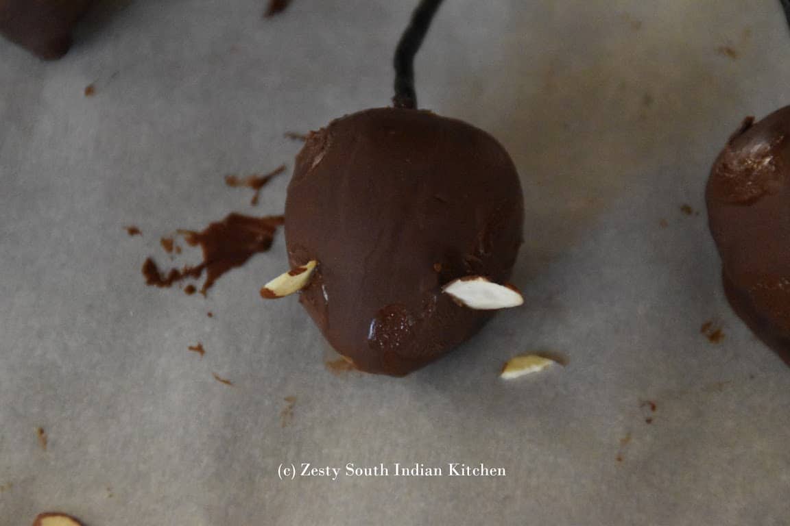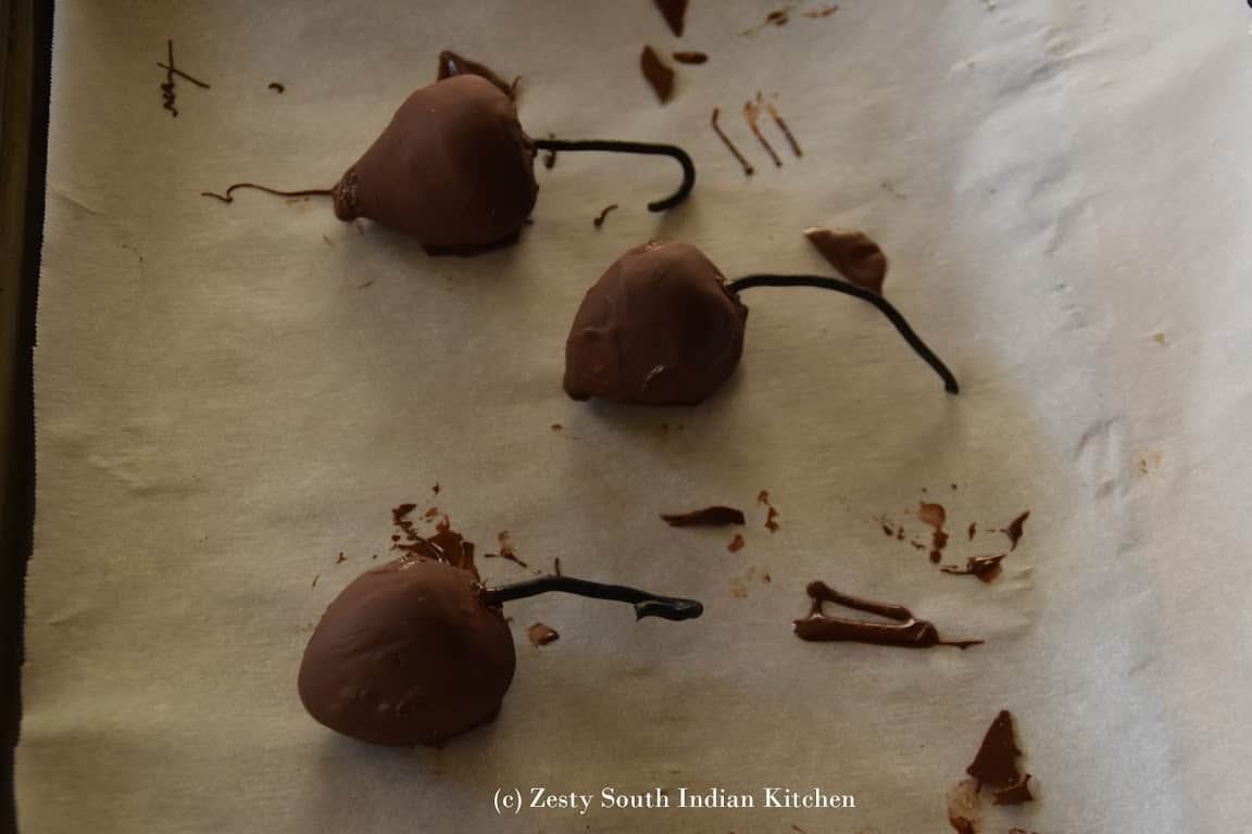 Use the remaining melted chocolate to attach a licorice piece to the rounded end of each fig for the tail.
