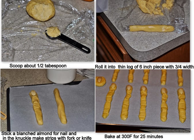 Remove dough from refrigerator in small amounts. Scoop about ½ tablespoon of at a time onto a piece of waxed paper. Use the waxed paper to roll the dough into a log of 6 inch length and ¾ inch wide, and then shape it into thin finger-shaped cookie. Press one almond into one end of each cookie to give the appearance of a long fingernail. Squeeze cookie near the tip and again near the center of each to give the impression of knuckles. You can also cut into the dough with a fork at the same points to help give a more finger-like appearance. Arrange the shaped cookies on the baking sheets.