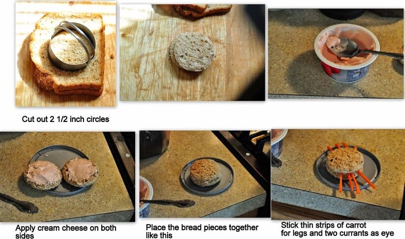 Place eight carrot sticks on the side of the bread circles for the spider legs. Place the remaining bread circles on top. Press two currants into each circle to be the eyes.
