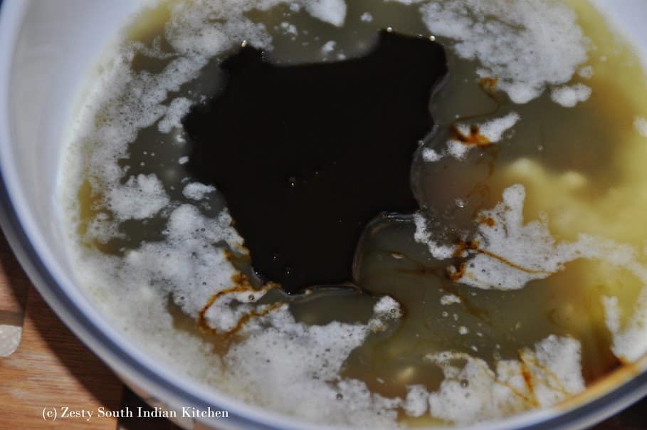In another bowl mix melted butter, sugar, honey, molasses, fresh ginger and orange zest.