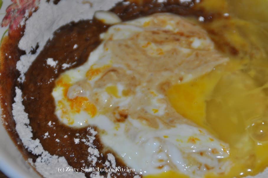 Using wooden spoon mix in the sourcream/yogurt, eggs and warm water.