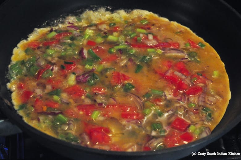 Delicious omelette made with pasteurized eggs,onion, veggies and spices.