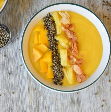 Serve with your favorite toppings, I used fresh mango, pineapple pieces and toasted coconut chips and toasted hemp seeds. Enjoy
