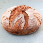 Preheat your oven to 475°F with a Dutch oven inside. Score your loaf, , and carefully transfer it into the hot pot. Bake 15 minutes covered then reduce the temperature to 450F and bake then 15 minutes covered. Then remove the lid and continue to bake uncovered until deep golden and crisp for 15-20 minutes. Until temperture