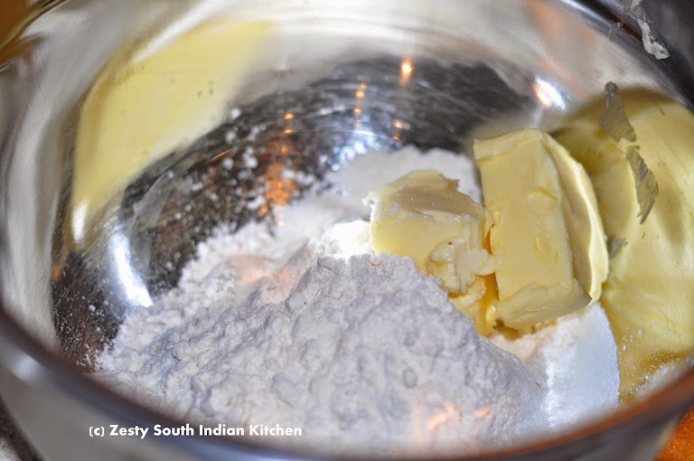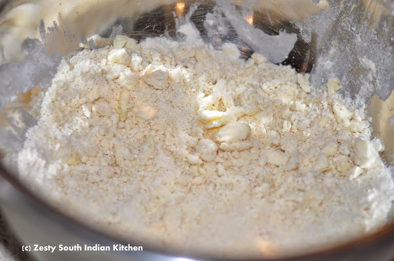 Whisk together the flour, sugar, shortening, butter and salt in a medium bowl.