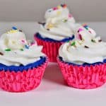 Fill liners ⅔ full, with heaping 1 tablespoon red color first and then white color and finally add blue color batter and bake for 22 minutes until centers are set and toothpick comes out clean.