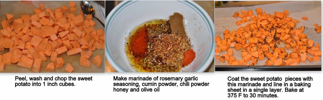Lay the sweet potatoes out in a single layer on a roasting tray. In bowl mix in oil, honey, rosemary garlic seasoning, cumin and red chili powder and coat over the potatoes. Roast for 30 minutes in oven or until tender.