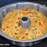 Grease an 8” kugelhopf mold or bundt pan well especially around the center (or whatever pan/ tin you plan to use). Place little cheese, green onion, red bell pepper, green bell pepper and green apple at the bottom of the mould.