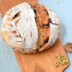 One hour after last stretch and fold do a lamination of the dough. Means spread the dough into thin sheet and then sprinkle figs, cardamom, and nigella seeds on the top and fold them into a letter fold.