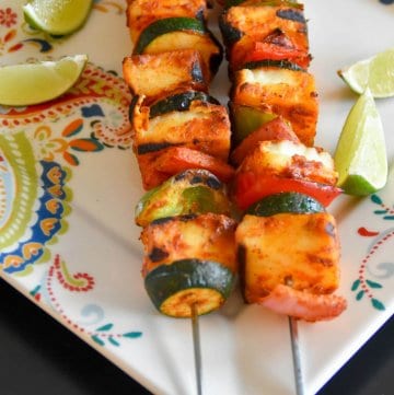 Delicious Tandoori Paneer skewers with vegetables and Tandoori chicken skewers with vegetables made with same marinade.