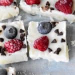 In a bowl mix Greek yogurt and honey well. Then, spread into 8x8 pan with parchment liner. Add raspberries, blueberries and chocolate chips uniformly. Then freeze yogurt for 4-6 hours. When you’re ready to serve, you can cut into squares.