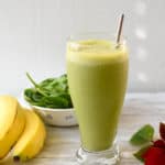 Delicious WONDERSHOWZEN Green Smoothie made with frozen banana, fresh spinach , almond butter, unsweetened almond milk.